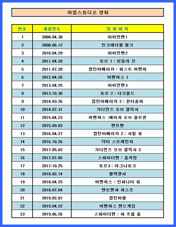 하지만, 마블스튜디오 영화들을 개봉연도 순으로 정리를 하면서 캐릭터와 내용을 접목을 해 보니