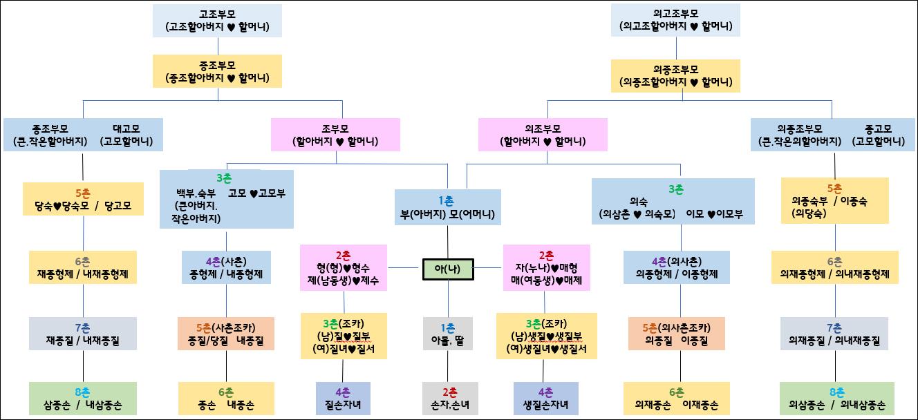 위에서 안내한 가족호칭을 촌수와 함께 관계도로 만들었습니다.