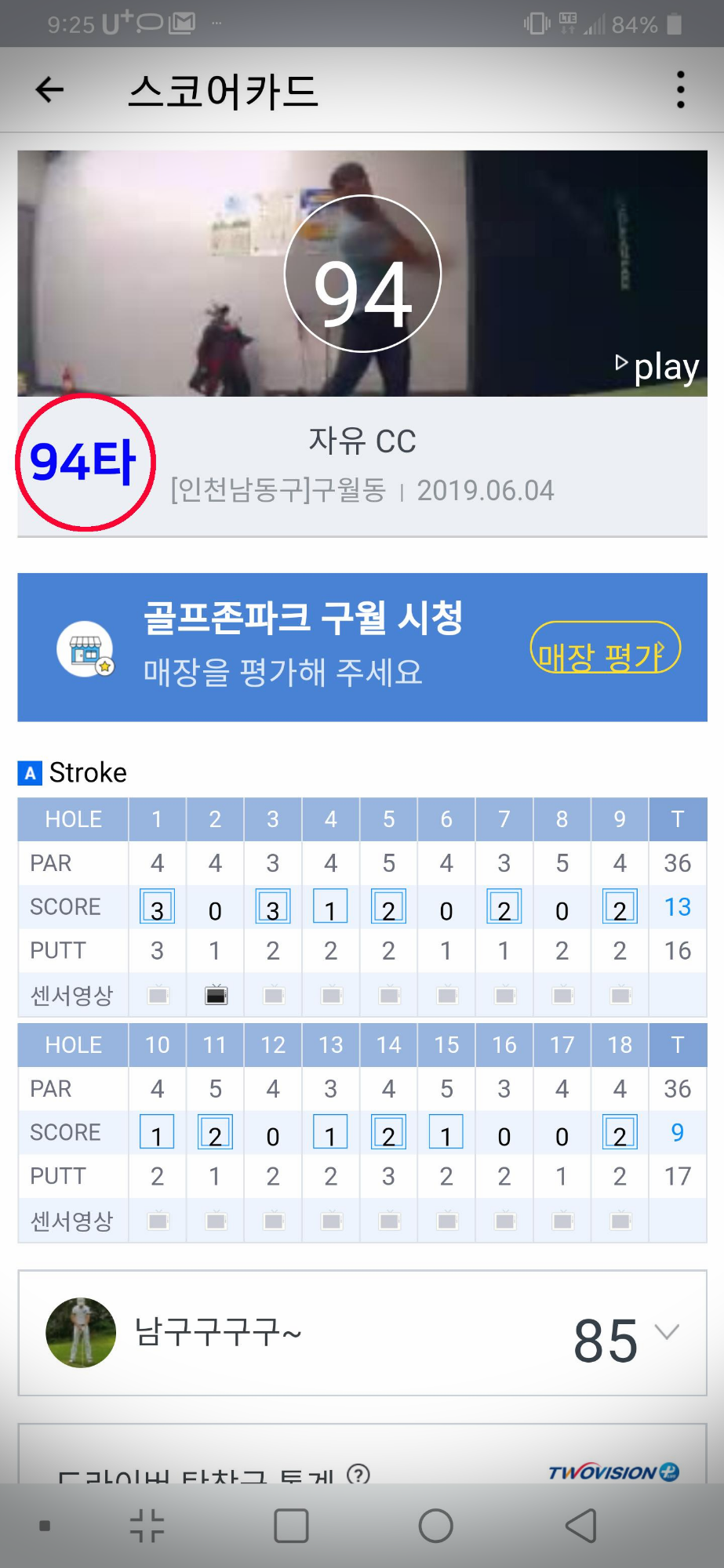 자, 이제 저의 어설픈 스크린골프 첫 결과를 보여드립니다.