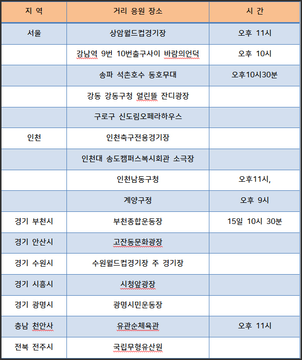 전국 각지에서 열리는 거리응원장소를 알아본다.