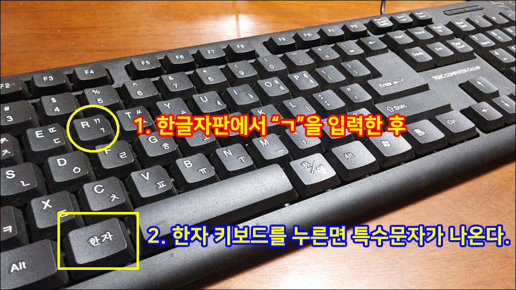 한글자판에서 'ㄱ' ~ 'ㅎ' 까지 입력한 후, 키보드의 한자 키보드를 누르면 해당 특수문자가 나온다.
