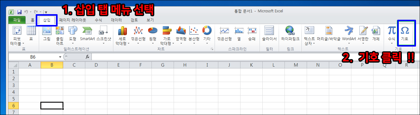 1. 엑셀의 탭 메뉴의 삽입 에서 리본 메뉴의 기호를 선택한다.